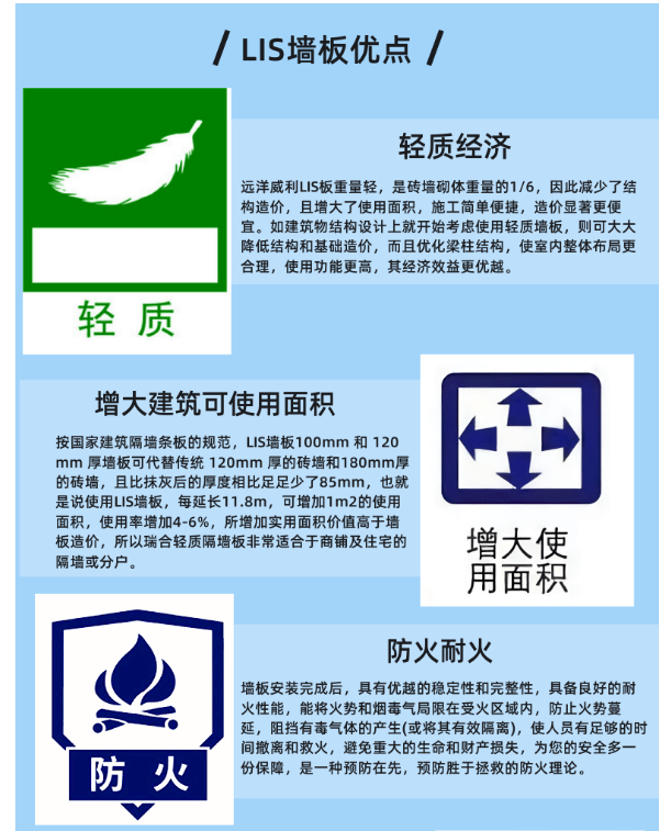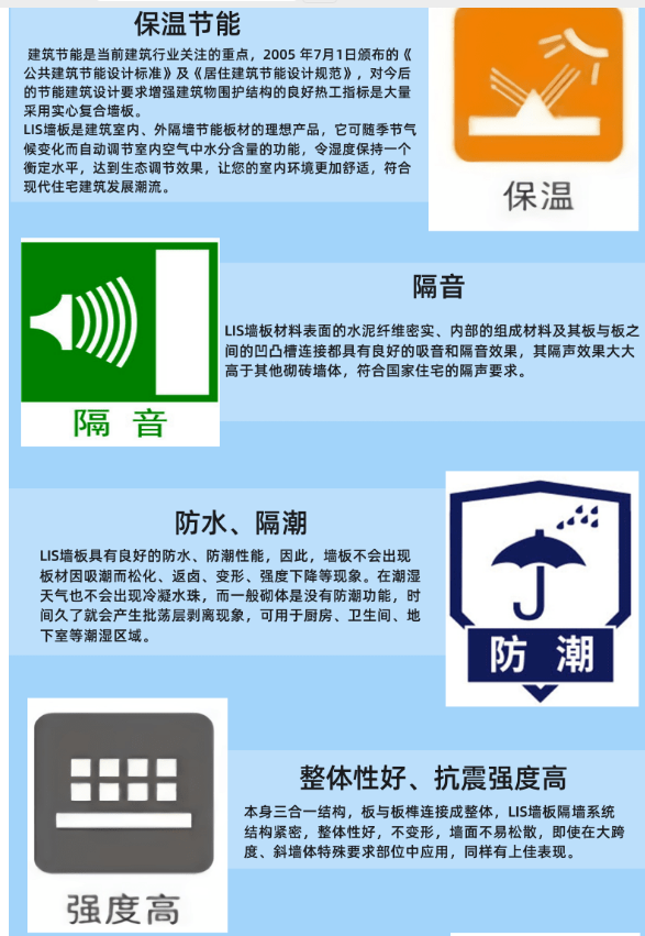 近年来,随着我国社会的进步和高层建筑的发展,人们居住要求的不断提高,传统的建筑材料由于消耗自然资源巨大,严重影响生态环境已不能满足建筑行业的发展。在国家节能减排政策和可持续发展战略的推动下,具有绿色环保、质轻性优的轻型隔墙板材料,越来越得到社会的认可。 远洋威利LIS墙板是针对现代多、高层框架建筑、生态住宅室内空间而研发生产的新型节能绿色多功能防火建筑材料。可广泛应用于各类建筑的内外隔墙、卫生间、楼地板、管井等区域。它的应用标志着墙体材料必然会出现更新换代趋势—取代传统的砌块、粘土砖,它全新的建筑意念与优异的性能满足现代建筑绿色节能需要的新型墙体材料。 -项目介绍-