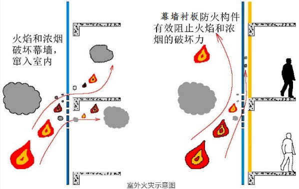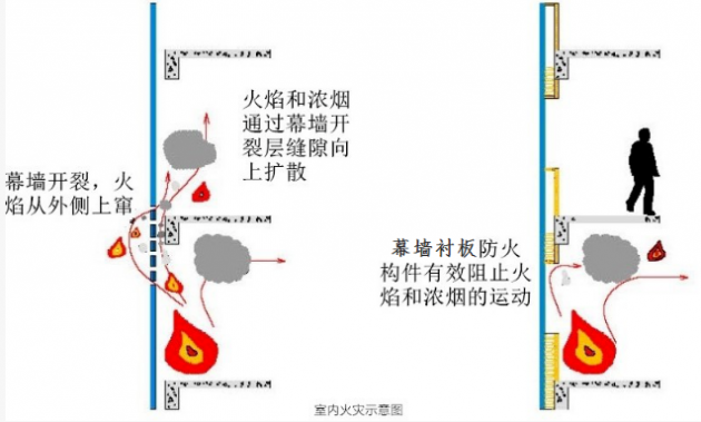 系统介绍 幕墙防火板的功能 幕墙防火构件可以有效阻止火灾中浓烟和火焰的破坏力。 如图一,当室内发生火灾时,由于垂直幕墙与水平楼板之间往往存在缝 隙,如果未经处理或处理不合理,火灾时,浓烟和火焰可通过这一层缝 隙向上窜到上一层楼层;当幕墙玻璃开裂掉落后,火焰从幕墙外侧窜至 上层外墙面烧裂上层玻璃幕墙后,窜入上层室内,引发室内可燃物的燃 烧,并产生连锁传递效应,整个建筑物可能遭遇火灾。 参考下图,左边为幕墙遭遇室内的火灾时,火焰和浓烟的扩散示意图。右边为使用幕墙衬板防火构件后,幕墙与其周边防火分隔构件间的缝隙、与楼板或隔墙外沿间的缝隙、与实体墙面洞口边缘间的缝隙等被封 堵,保证下层的室内火灾无法通过层间或破损的幕墙上窜到上一层。 ![]() 参考下图:当幕墙的外部发生火灾时(比如燃烧体),如果幕墙本身 的防火性能不高,火灾会破坏幕墙,由于负压的作用,火焰和浓烟 会迅速向室内扩散,从而引发室内的可燃物(如家具)燃烧,火灾 从而会进一步加强,火势会向更多的部位扩散;同时,向上的火焰 和浓烟会破坏幕墙,窜向上一层,引起上一层的室内可燃物体燃 烧,产生恐怖的破坏。整体的墙体防火可以保证下层的室内火灾无法向上窜到上一层,阻止幕墙外部的火灾破坏幕墙后向室内传递。 使用了幕墙衬板还可以有效阻止室内外的热量交 换,有节能保温的作用。