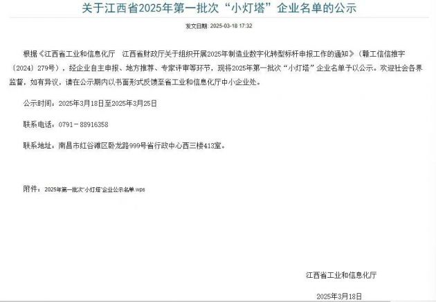 喜讯传来|江西远洋威利入选江西省“小灯塔”企业近日,江西省工业和信息化厅公示了2025年第一批“小灯塔”企业名单,江西远洋威利实业有限公司名列其中,这不仅标志着远洋威利在数字化转型发展道路中迈上新台阶,更是对远洋威利多年来在企业发展、技术创新、数字化转型等多方面努力的高度认可。
