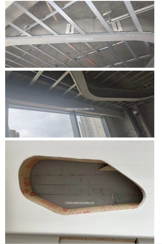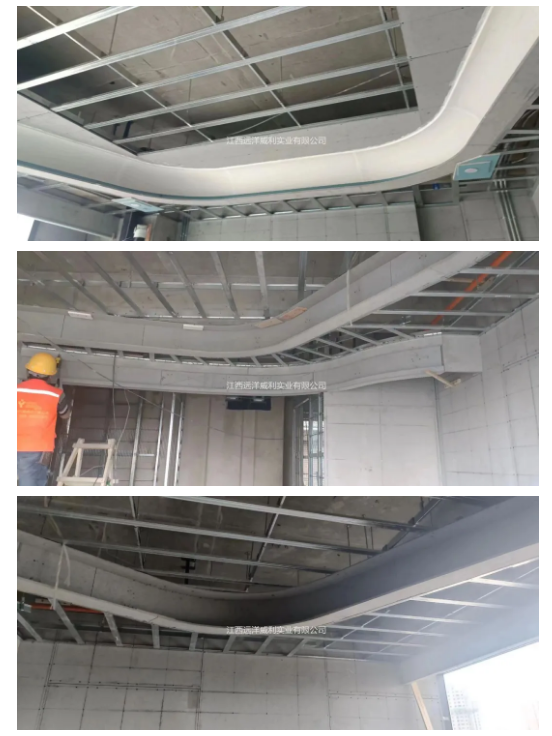 西安高新区英迪格酒店位于西安市高新区西沣辅道以西,信息大道以南,用地面积6760.6平方米,总建筑面积22723.43平方米,地上10层,地下3层。 项目名称:洲际酒店下属西安文博英迪格酒店 应用产品:低密度灰硅基层板 使用厚度:9mm 应用部位:造型弯曲吊顶、卫生间隔断 产品应用亮点:代替木工阻燃板,防火A级、无甲醛、握钉力强、易施工、可轻松打枪钉、表面可做任意装饰 01 施工实拍