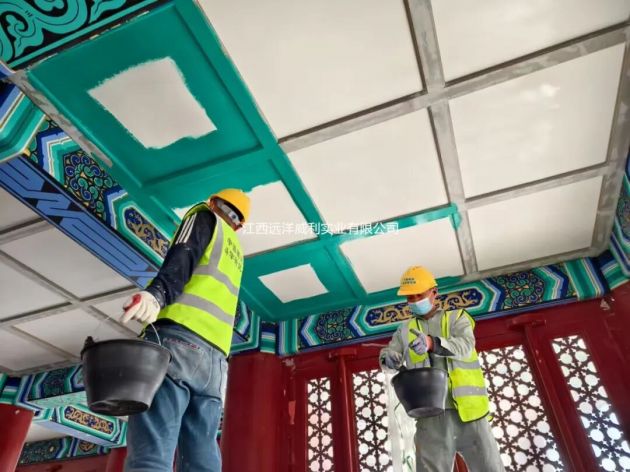 应用优势 1、A1级防火:为古建筑穿上“隐形铠甲” 远洋威利低密度灰硅基层板通过国家A1级防火认证,9mm耐火极限达2小时,遇明火不燃、无烟无毒,完美解决古建筑木质结构防火痛点。修缮后的永定楼吊顶不仅通过消防验收,更将火灾风险降至最低,为文化遗产筑牢安全防线。 2、表面可装饰性:还原传统艺术的“画布基因” 板材表面经特殊工艺处理,具备优异的附着力与平整度,可直接进行传统矿物颜料手绘。修缮团队在基板上精准复原了“祥云仙鹤”彩画,色彩饱和度高,且抗开裂、抗剥落,历经四季温湿度变化仍保持鲜亮如初,实现“原工艺、新材料”的无缝融合。 3、轻质高强:古建结构的“友好搭档” 板材密度低,重量较传统材料减轻30%,大幅降低吊顶荷载压力,避免对原有梁柱造成结构性损伤,契合古建筑“最小干预”修缮原则。