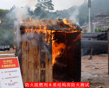 活动中,受试建筑严格采用了与肇兴侗寨现有民居相同树种、相同年代的建筑材料与建筑工艺,以确保试验结果能够准确地反映实际建筑的防火性能。共有5家厂商和7栋受试房屋参与了本次试验,涉及防火阻燃工艺包括透明型防火涂料、水基型阻燃剂、不燃级防火建材等,试验设置了对照组。 测试现场采用人工点火的方式在建筑内部设置火源,模拟房屋内火势向刷涂防火涂料或阻燃剂的房屋蔓延,以测试受火房屋耐火状态、时间等情况,现场设置了热成像红外摄像机等专业设备以记录阻燃时间和不同阶段温度等数据。