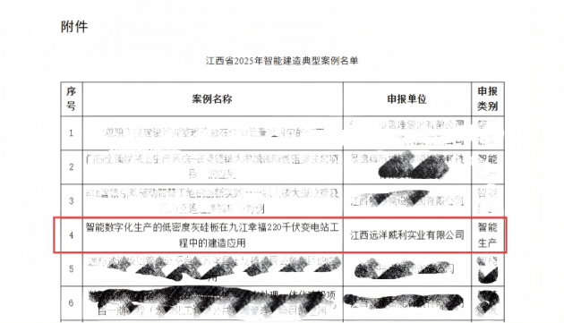 再获省级荣誉 |成功入选2025年智能建造典型案例为落实《关于推动智能建造与建筑工业化协同和加快新型建筑工业化发展的实施意见》《江西省加快推进智能建造发展工作方案》等文件要求,推进工程建设行业智能建造技术的推广应用,助力行业智能建造标准优化与产业升级,江西省住房和城乡建设厅开展了江西省2025年智能建造典型案例评审工作。近日,江西省住房和城乡建设厅正式公示2025年智能建造典型案例评审结果,江西远洋威利实业有限公司申报的《智能数字化生产的低密度灰硅板在九江幸福220KV变电站工程中的建造应用》凭借创新技术与实践价值,成功入选江西省2025年典型案例名单,成为全省智能生产领域的标杆示范项目,为江西智能建造发展注入强劲动能!